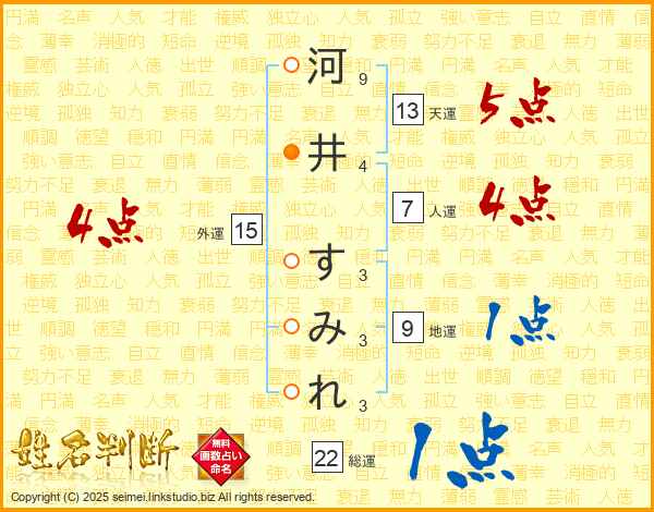 生活面を象徴する運勢です。外部から受ける影響力を表し、結婚運、家庭運や職場、環境への順応性を表します。総運から人運を引いた画数。姓や名が1文字の場合を除く。