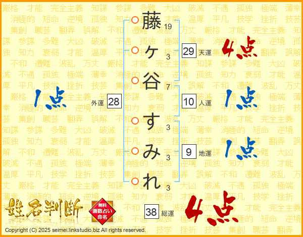 生活面を象徴する運勢です。外部から受ける影響力を表し、結婚運、家庭運や職場、環境への順応性を表します。総運から人運を引いた画数。姓や名が1文字の場合を除く。