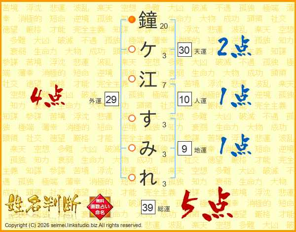鐘(20画)ケ(3画)江(7画) す(3画)み(3画)れ(3画)