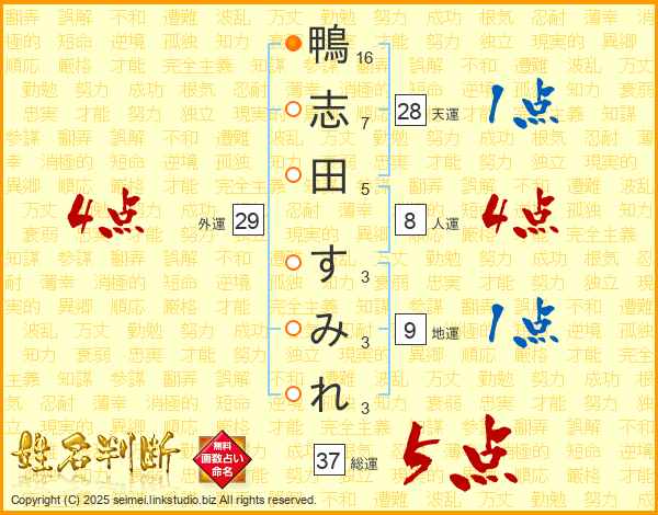 鴨(16画)志(7画)田(5画)  す(3画)み(3画)れ(3画)