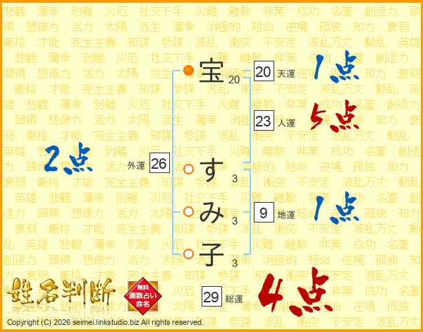 宝すみ子さんの総運は29画の4点!