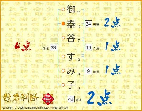 御(11画)器(16画)谷(7画) す(3画)み(3画)子(3画)