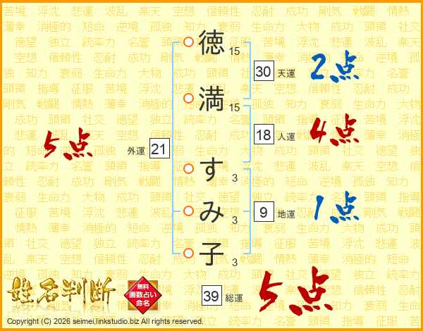 徳(15画)満(15画) す(3画)み(3画)子(3画)