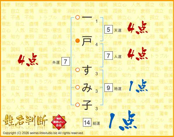 生活面を象徴する運勢です。外部から受ける影響力を表し、結婚運、家庭運や職場、環境への順応性を表します。総運から人運を引いた画数。姓や名が1文字の場合を除く。