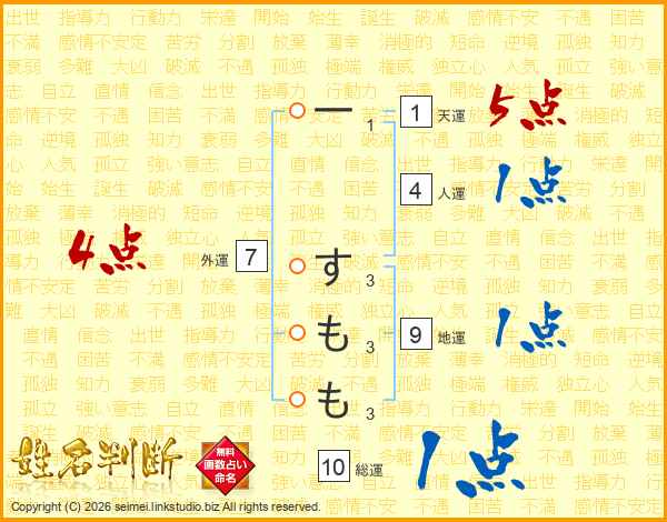 生活面を象徴する運勢です。外部から受ける影響力を表し、結婚運、家庭運や職場、環境への順応性を表します。総運から人運を引いた画数。姓や名が1文字の場合を除く。