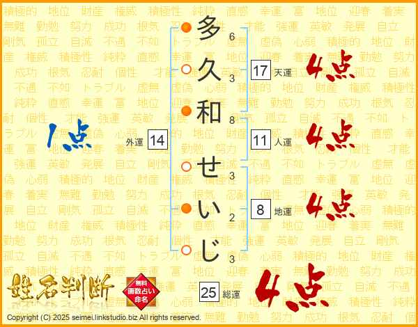 生活面を象徴する運勢です。外部から受ける影響力を表し、結婚運、家庭運や職場、環境への順応性を表します。総運から人運を引いた画数。姓や名が1文字の場合を除く。