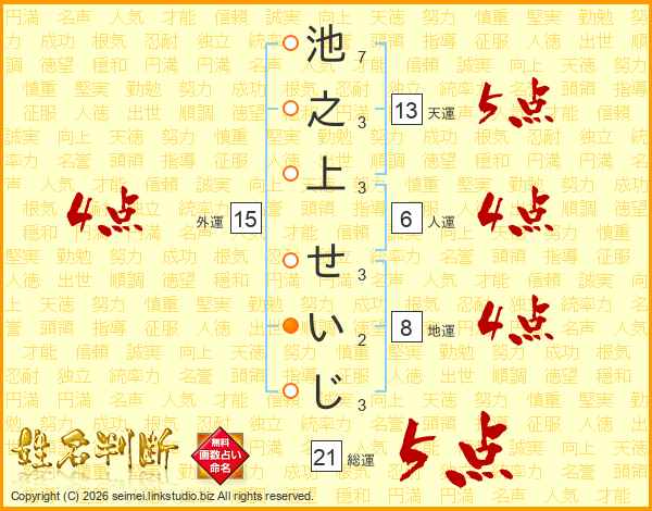 生活面を象徴する運勢です。外部から受ける影響力を表し、結婚運、家庭運や職場、環境への順応性を表します。総運から人運を引いた画数。姓や名が1文字の場合を除く。
