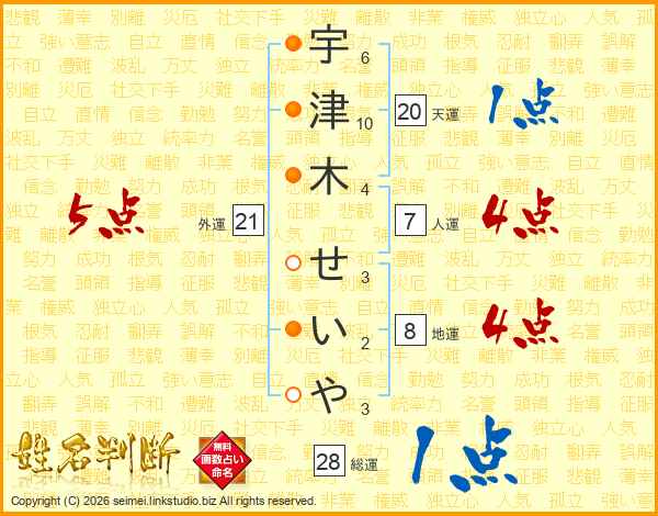 宇(6画)津(10画)木(4画) せ(3画)い(2画)や(3画)