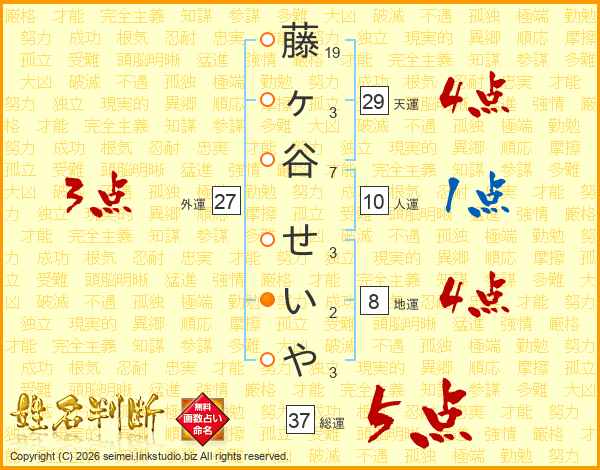 藤(19画)ヶ(3画)谷(7画) せ(3画)い(2画)や(3画)