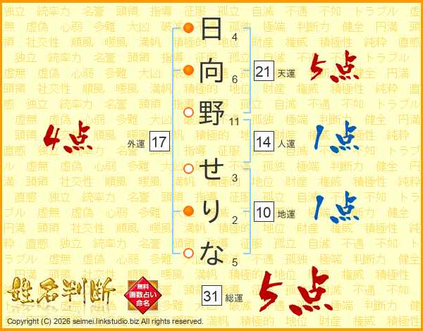 生活面を象徴する運勢です。外部から受ける影響力を表し、結婚運、家庭運や職場、環境への順応性を表します。総運から人運を引いた画数。姓や名が1文字の場合を除く。