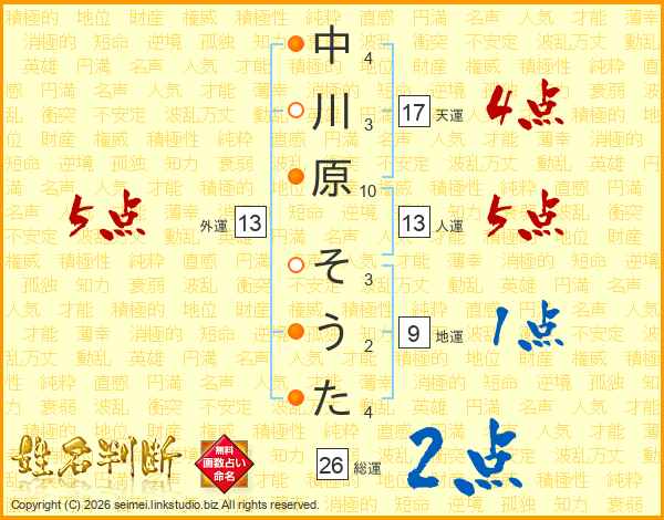 生活面を象徴する運勢です。外部から受ける影響力を表し、結婚運、家庭運や職場、環境への順応性を表します。総運から人運を引いた画数。姓や名が1文字の場合を除く。