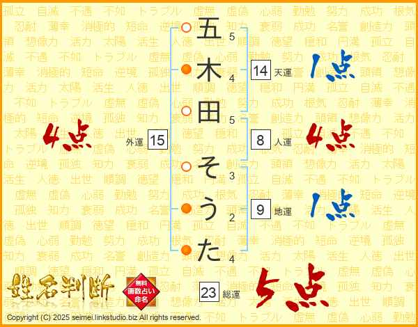 生活面を象徴する運勢です。外部から受ける影響力を表し、結婚運、家庭運や職場、環境への順応性を表します。総運から人運を引いた画数。姓や名が1文字の場合を除く。
