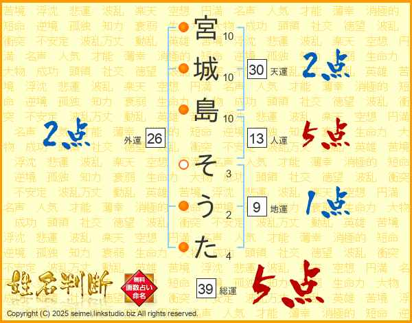 生活面を象徴する運勢です。外部から受ける影響力を表し、結婚運、家庭運や職場、環境への順応性を表します。総運から人運を引いた画数。姓や名が1文字の場合を除く。