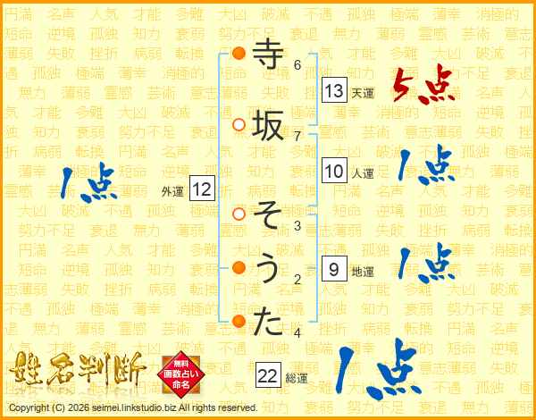 生活面を象徴する運勢です。外部から受ける影響力を表し、結婚運、家庭運や職場、環境への順応性を表します。総運から人運を引いた画数。姓や名が1文字の場合を除く。