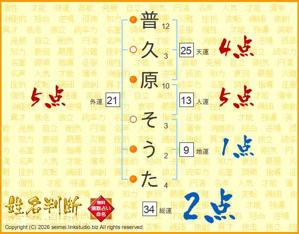 普久原そうたさんの天運は25画の4点!
