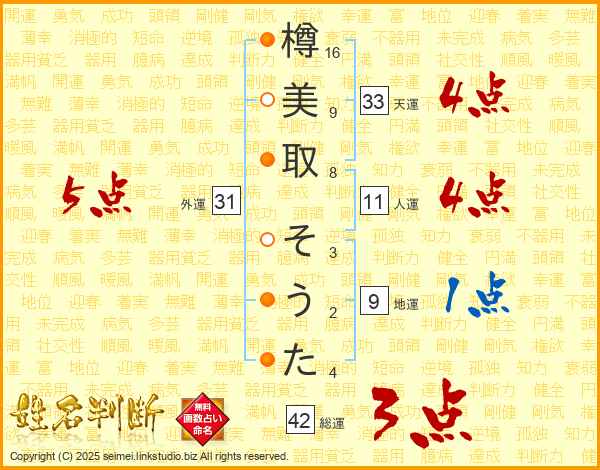 あなたの人生を表す1番重要な運勢です。生涯を通じて影響する総合運となり、主に50歳以降の晩年期に影響を及ぼします。苗字と名前の合計画数。