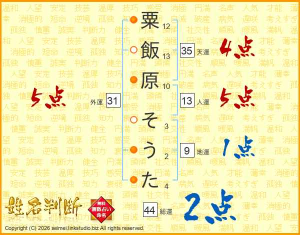 粟飯原そうたさんの総運は44画の2点!
