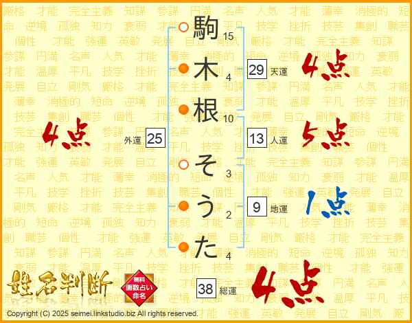 駒(15画)木(4画)根(10画) そ(3画)う(2画)た(4画)