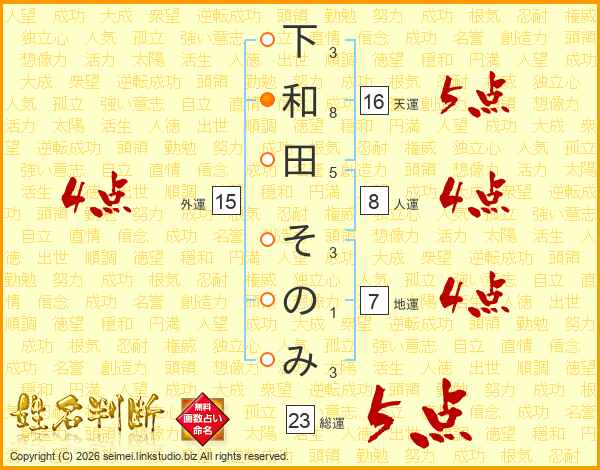 生活面を象徴する運勢です。外部から受ける影響力を表し、結婚運、家庭運や職場、環境への順応性を表します。総運から人運を引いた画数。姓や名が1文字の場合を除く。