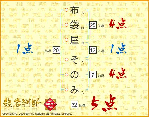 生活面を象徴する運勢です。外部から受ける影響力を表し、結婚運、家庭運や職場、環境への順応性を表します。総運から人運を引いた画数。姓や名が1文字の場合を除く。