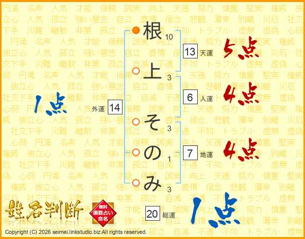 生活面を象徴する運勢です。外部から受ける影響力を表し、結婚運、家庭運や職場、環境への順応性を表します。総運から人運を引いた画数。姓や名が1文字の場合を除く。