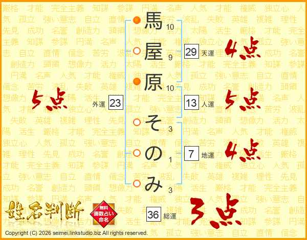 馬屋原そのみさんの総運は36画の3点!