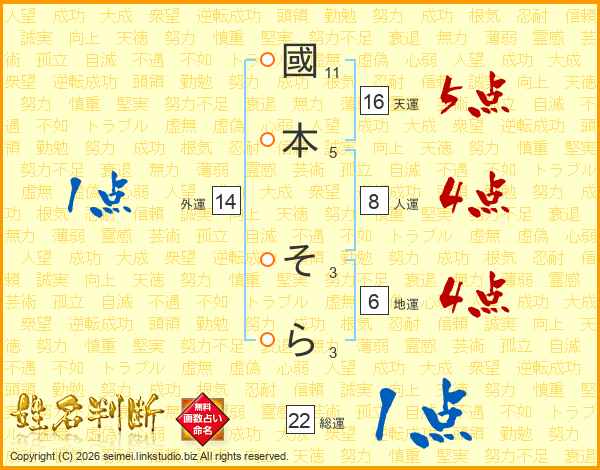 生活面を象徴する運勢です。外部から受ける影響力を表し、結婚運、家庭運や職場、環境への順応性を表します。総運から人運を引いた画数。姓や名が1文字の場合を除く。