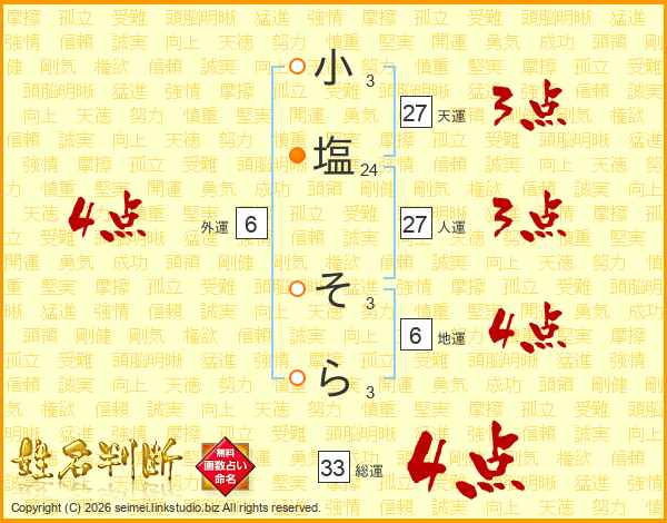 生活面を象徴する運勢です。外部から受ける影響力を表し、結婚運、家庭運や職場、環境への順応性を表します。総運から人運を引いた画数。姓や名が1文字の場合を除く。