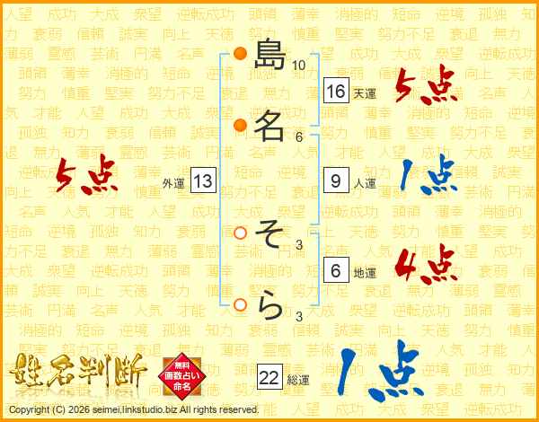 島名そらさんの総運は22画の1点!