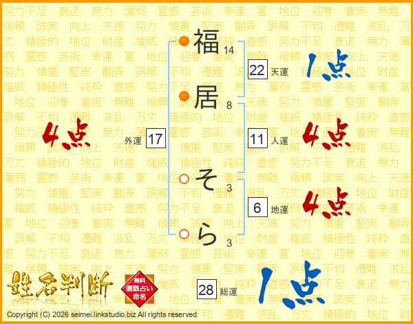 生活面を象徴する運勢です。外部から受ける影響力を表し、結婚運、家庭運や職場、環境への順応性を表します。総運から人運を引いた画数。姓や名が1文字の場合を除く。