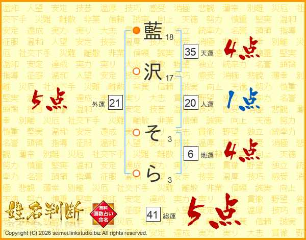 藍沢そらさんの総運は41画の5点!
