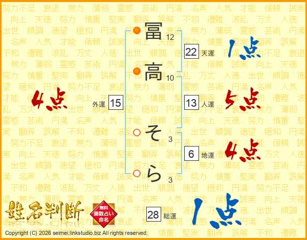 冨高そらさんの総運は28画の1点!