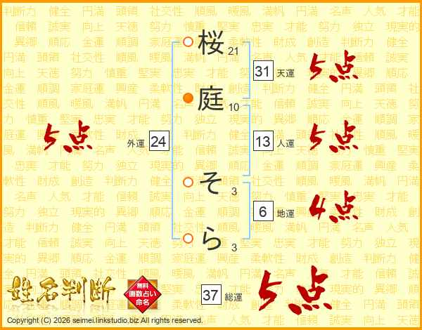 桜庭そらさんの総運は37画の5点!