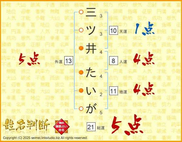 あなたの人生を表す1番重要な運勢です。生涯を通じて影響する総合運となり、主に50歳以降の晩年期に影響を及ぼします。苗字と名前の合計画数。