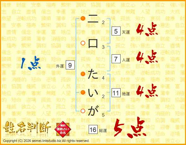 あなたの人生を表す1番重要な運勢です。生涯を通じて影響する総合運となり、主に50歳以降の晩年期に影響を及ぼします。苗字と名前の合計画数。