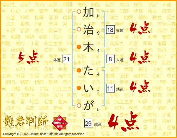 加治木たいがさんの総運は29画の4点!