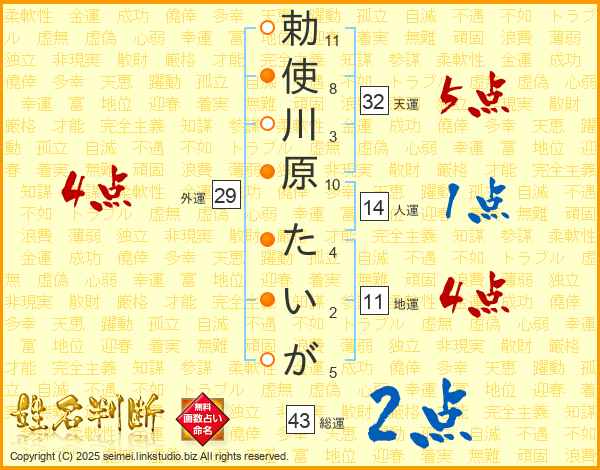勅使川原たいがさんの総運は43画の2点!