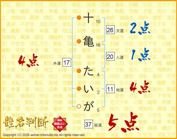 十(10画)亀(16画) た(4画)い(2画)が(5画)