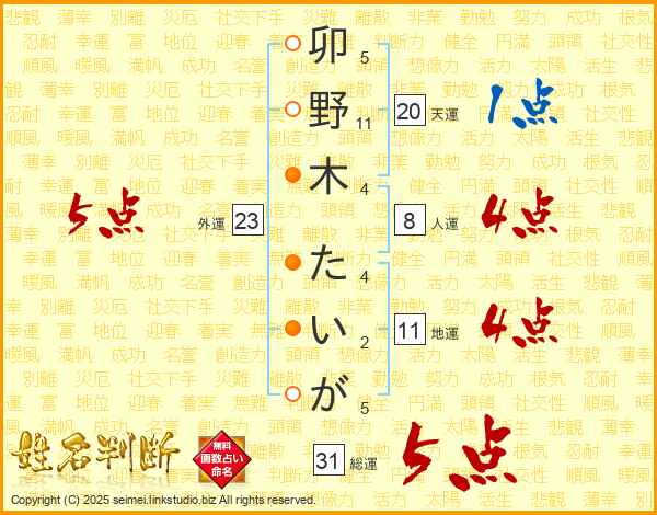 生活面を象徴する運勢です。外部から受ける影響力を表し、結婚運、家庭運や職場、環境への順応性を表します。総運から人運を引いた画数。姓や名が1文字の場合を除く。