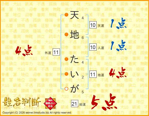 天地たいがさんの総運は21画の5点!