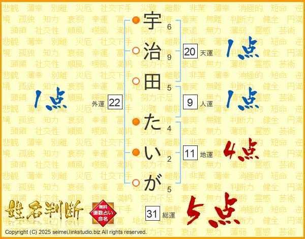 宇治田たいがさんの総運は31画の5点!