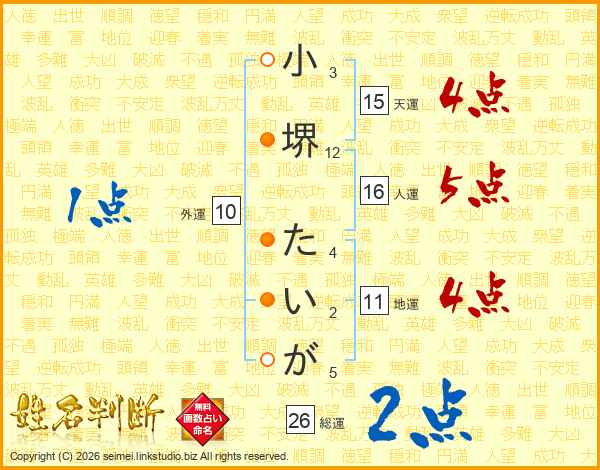 小堺たいがさんの総運は26画の2点!