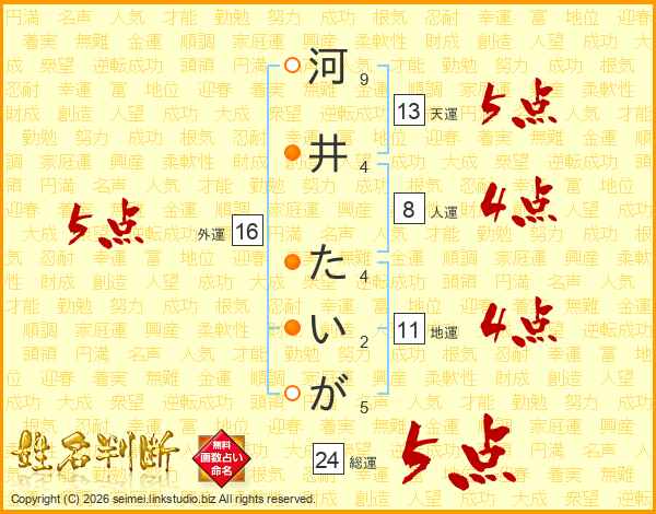 河井たいがさんの総運は24画の5点!