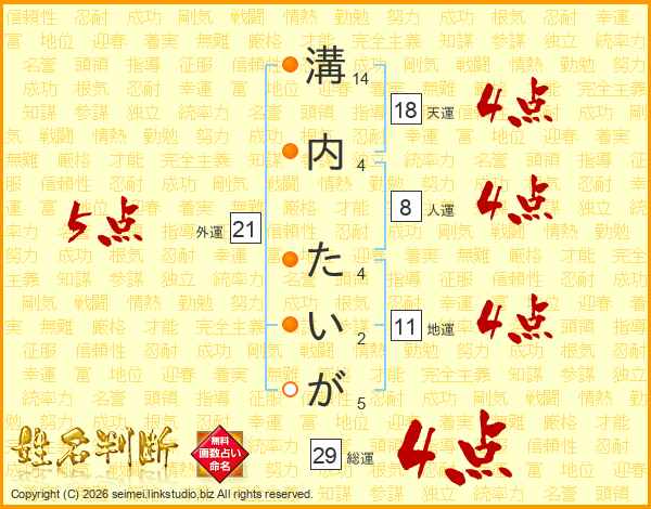 溝内たいがさんの総運は29画の4点!