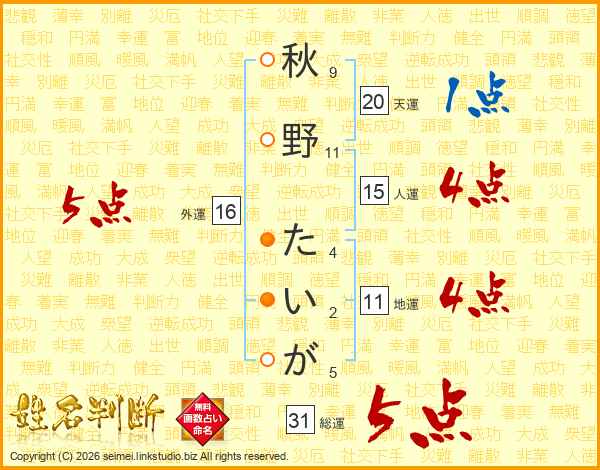 生活面を象徴する運勢です。外部から受ける影響力を表し、結婚運、家庭運や職場、環境への順応性を表します。総運から人運を引いた画数。姓や名が1文字の場合を除く。