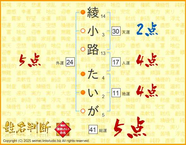 綾(14画)小(3画)路(13画) た(4画)い(2画)が(5画)