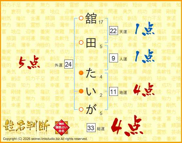 舘田たいがさんの総運は33画の4点!