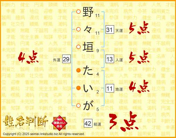 生活面を象徴する運勢です。外部から受ける影響力を表し、結婚運、家庭運や職場、環境への順応性を表します。総運から人運を引いた画数。姓や名が1文字の場合を除く。
