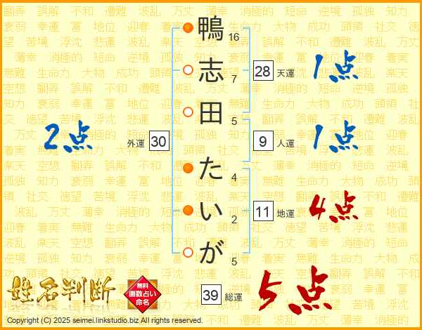 鴨志田たいがさんの総運は39画の5点!