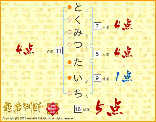 あなたの人生を表す1番重要な運勢です。生涯を通じて影響する総合運となり、主に50歳以降の晩年期に影響を及ぼします。苗字と名前の合計画数。